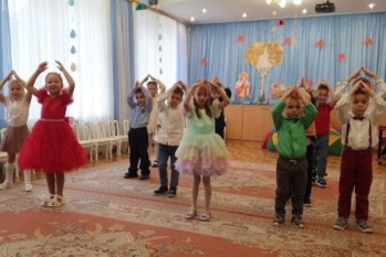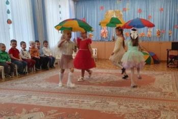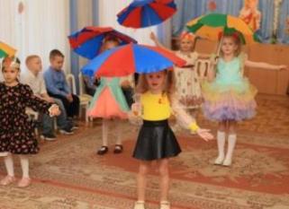 Дети с удовольствием прочитали ей стихи, исполнили песни и красивые танцы: с разноцветными листочками и с зонтиками. Не побоялись непогоды, надели галоши и посоревновались в эстафете.