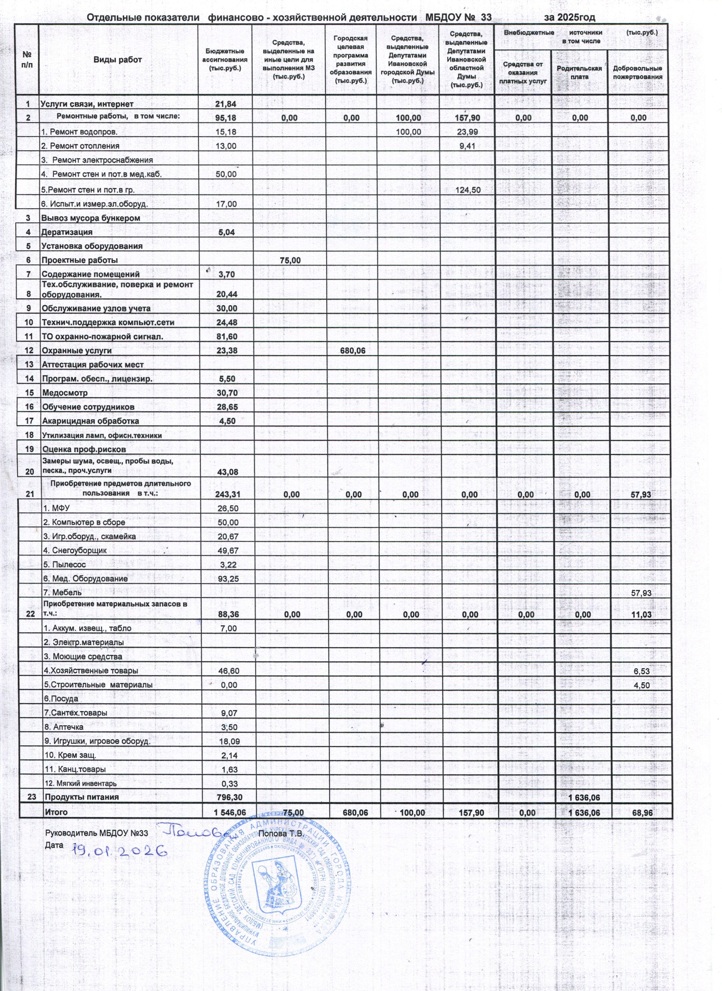 Отдельные показатели финансово-хозяйственной деятельности МБДОУ № 33 за 2025 г