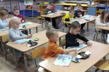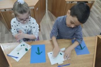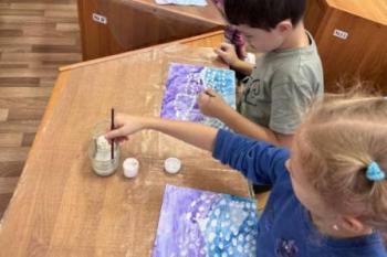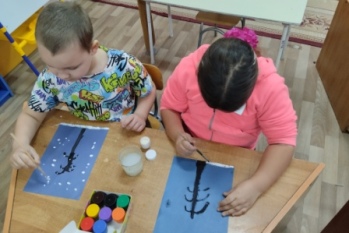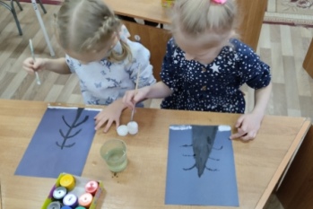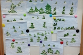 Работы выполняли новым для них методом - тычка жёсткой кисточкой. Красивый получился лес!